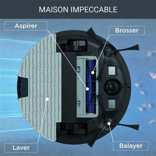 Un moteur puissant de 2 700 Pa pour aspirer toutes les poussières du quotidien, une brosse centrale pour les grosses poussières, 2 brossettes latérales pour aller dans tous les recoins et le système de lingette humide Aqua Power pour laver les sols.